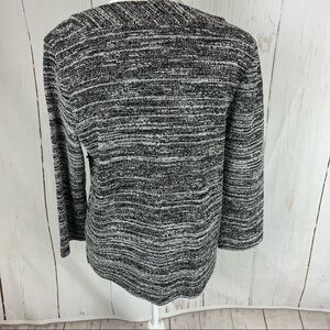 Karl Lagerfeld womens tweed sweater with pearl embellishment. 3/4 length sleeves. Black and white cotton/ poly blend fabric.