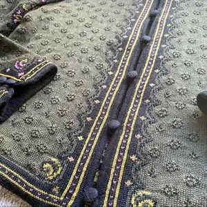 olive cardigan with light violet floral accents