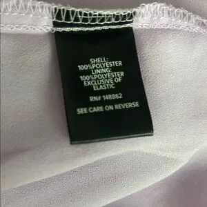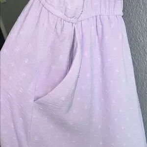 Light purple dress with delicate lace accents. Features a tie neckline.