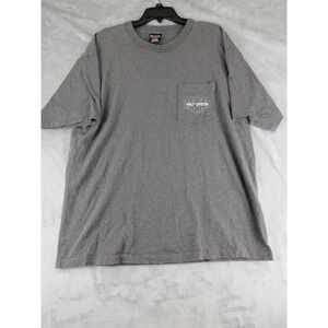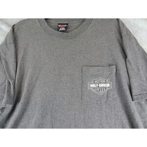 Keywords: Harley Davidson T-Shirt, Motorcycle Apparel, Pocket Tee, Men's T-Shirt, Graphic Tee, Casual Wear, Streetwear, Biker Style, XL T-Shirt, Gray T-Shirt, Pre-Shrunk Cotton, Made in USA, Harley Davidson Logo, Comfortable Tee