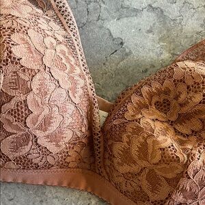 Elegant lace bralette set featuring a rich burgundy and warm brown color. Perfect for comfort and style. I’m a 36B.