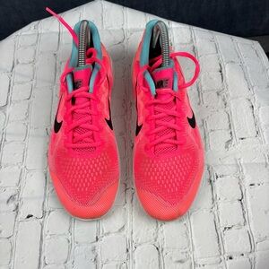 Bright neon pink with teal accents. Black Nike swoosh on the side.