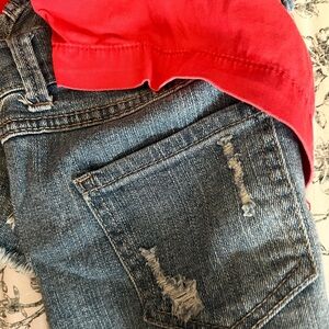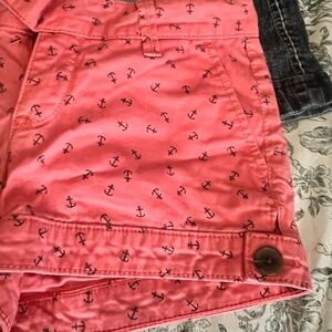 Stylish jean shorts with distressed details. Vibrant red and patterned options included. Perfect for casual wear.used in good condition 5 for one price size 25,1&3