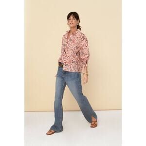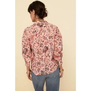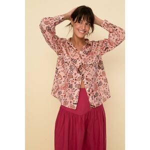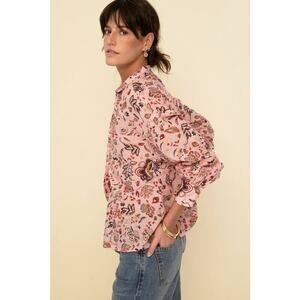 Tailored in a soft lightweight new cotton voile with silk effect, this new style is one of our favorite Is an oversized button-down blouse with stand collar and loose fit , full-length sleeves and mother-of-pearl buttons Wear it loose or tuck it into a skirt or a denim It features a beautiful floral print in delicate colors 100% cotton Made in India SIZE & FIT Bego is 5´9 and is wearing M. PTP is 22”.