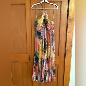 HOUSE OF HARLOW PLEATED TIE-NECK CUT-OUT-BODICE BACKLESS HALTER MAXI DRESS sz L