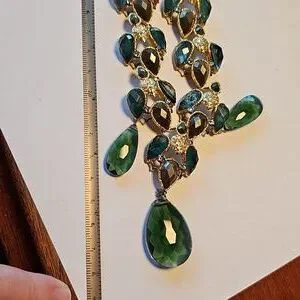 This is an older piece featuring real stones with three large stone pendants. The main stone came off at some point , but my husband wired it back on. See last photo. Discounted a bit for this reason. These ususlly list for about 300 on here.