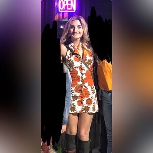 Step out in style with this vintage-inspired floral mini dress. Featuring bold orange and brown flowers, it's a perfect choice for a chic, casual look.