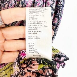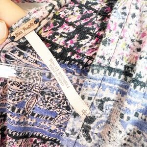 Free people pink blue green purple pattern boho short sleeve smocked waist tie back shirt.
