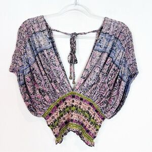 FREE PEOPLE PINK PURPLE BOHO SHORT SLEEVE DEEP V-NECK SMOCKED CROP SHIRT SMALL