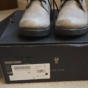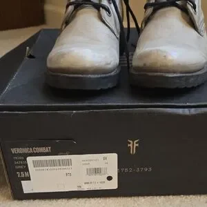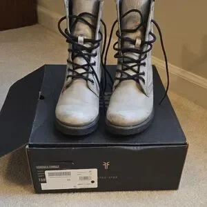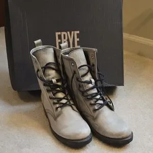 Stylish Frye combat boots in gray. Durable with lace-up design. Versatile for any look.