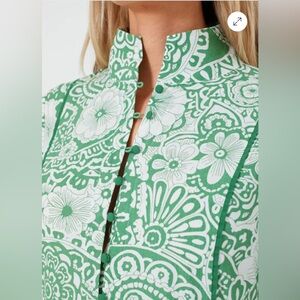 The Green and White Floral Hillsborough Dress is perfect for warm, breezy days lounging by the beach or going to lunch with friends. This midi boasts three-quarter length puff sleeves, a fit and flare silhouette, and a tiered skirt with piping panels. The eye-catching green is the cherry on top, creating an enchanting swirl of patterns and shapes. Pair with heels and a clutch, or with simple sandals and gold jewelry.