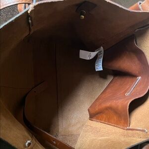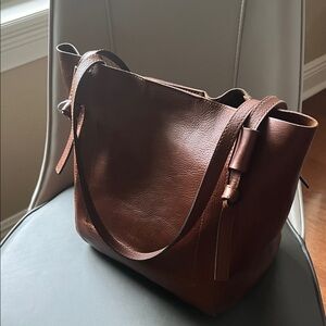 Madewell leather bag with two outside pockets and one inside pocket. This elegant brown leather tote bag is perfect for any occasion. Its sleek design and rich color make it a versatile accessory for your wardrobe. 14”x10.5”x6”
