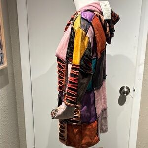 This jacket showcases a striking patchwork design with bold purple and orange hues. Its hooded, zip-up style and mid-length cut offer a unique and artistic flair. The blend of diverse fabric textures enhances its creative and standout appearance.