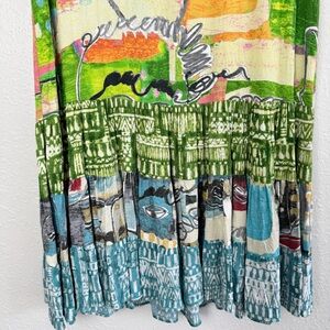 Deep u-neckline. Drop waist body. Three tiers of the same print ruffles. 100% spun crushed Jams World Rayon.