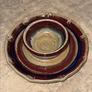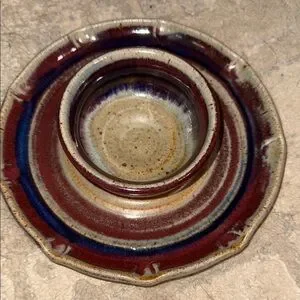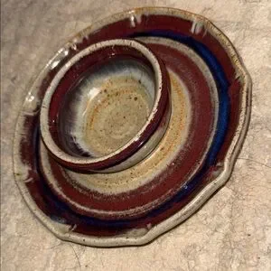 Enhance your home decor with this handcrafted ceramic pottery bowl/ plate. Featuring a stunning blend of red, blue, and cream hues, this set adds a touch of elegance to any space. Perfect for small serving of baby carrots with dip, chips with guacamole, crab dip with crackers . Could also be used in office to hold paperclips, on dresser to hold jewelry and hair ties, etc. One of a kind artisan crafted.