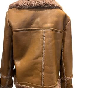 Stylish leather jacket with plush shearling lining. Features large front pockets and a cozy collar. Perfect for a chic, warm look.