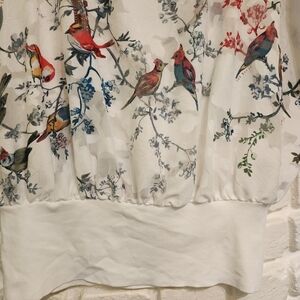 Charming blouse with vibrant bird and floral design. Soft white background enhances the colorful print. Ideal for stylish outings.