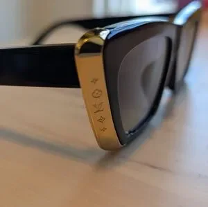 Sophisticated sunglasses with a bold black frame. Accented with elegant gold details. Perfect for a stylish look.