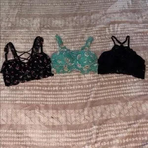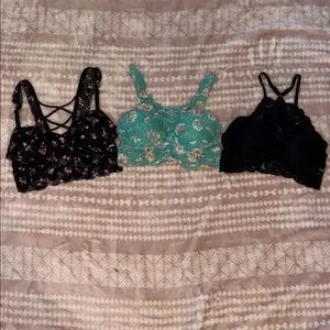 Set of three bras with floral and lace designs. Includes black with pink floral, teal with lace, and black lace styles. Elegant and stylish.