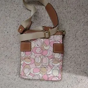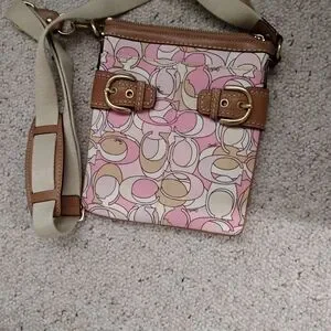 Chic Coach crossbody with pink and tan pattern. Features adjustable strap and buckle accents. Only used a few times Good Condition