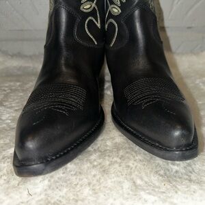 Made in Italy. Curved topline with accent tabs. Western-inspired embroidery throughout. Pointed toe. Leather lining. Slanted block heel. Approx 40mm/ 1.5 inch heel.Approx 222mm/ 8.75 inch shaft.