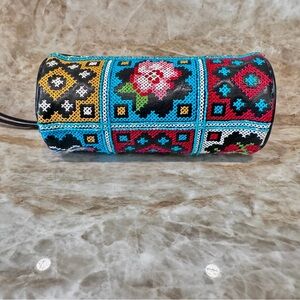 This rare wristlet showcases Fiore’s signature vibrant embroidery — a mosaic of cross-stitch geometric and floral motifs in rich jewel tones of red, turquoise, gold, and cream, set against supple black leather and calf leather