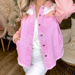 Stylish pink and white colorblock denim jacket. Features button-up front and chest pockets. Worn once