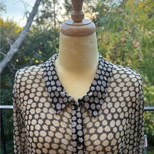 Charming sheer blouse with daisy print. Button-up front and classic collar. Perfect for layering. This can be worn as a blouse or dress, gathered in the front for form flattering . Super stretchy for multiple sizes. Excellent condition.