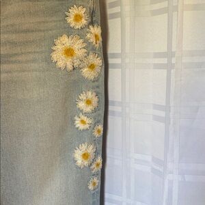 Stylish light blue jeans with charming daisy embroidery. Perfect for a casual day out.