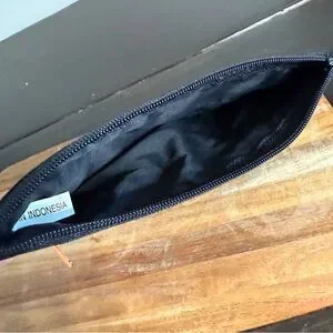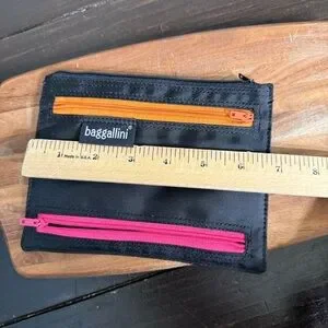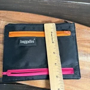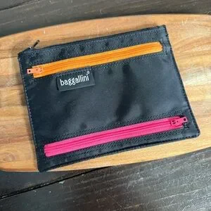 Chic Baggallini pouch in black. Features colorful zippers for a pop of style. Ideal for organizing small items.
