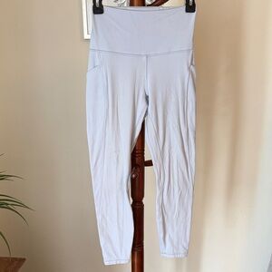 Set of Lululemon leggings in pale blue, pink, and purple. Comfortable and stylish for any workout. Both the pale blue & wisteria purple have pockets & are double lined. The pink does not have pockets.