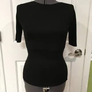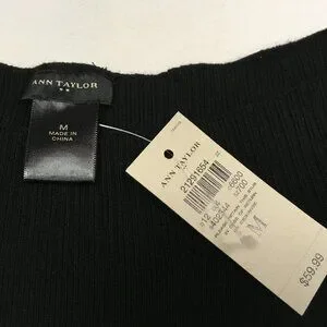 Ann Taylor New with tags versatile short sleeved black sweater. Useful for many different occasions from casual with jeans to dressed up with skirts or slacks. See detail at neckline. Ribbing and "v" shape at waist draw the sweater in toward the body for a belted effect. (photo of waist is lightened to better show detail) Easy care 84% rayon, 16% nylon. Machine wash and dry.
