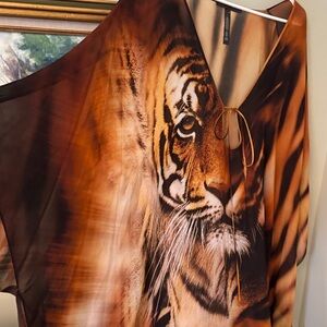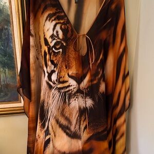Stunning tiger print kaftan dress. Features a bold tiger design with rich brown and tan hues.
