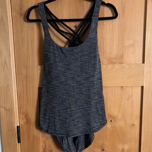 Stylish gray tank top. Features crisscross back design. Perfect for workouts or casual wear.