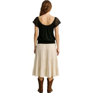 This romantic black blouse by Xhilaration features a sheer floral lace yoke and cap sleeves, paired with a soft blouson body and smocked waistband. A perfect blend of comfort and style, it’s ideal for cottagecore, boho, and prairie-inspired looks.