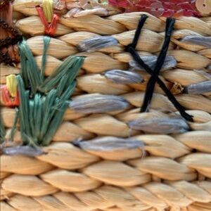 Embrace a tropical vibe with this stylish woven tote bag featuring a charming flamingo design. Perfect for beach days or casual outings, this bag combines functionality with a fun aesthetic. The natural tan color complements any outfit. There is some wear and tear, the leg to the flamingo to the left is broken/damaged, there is loose thread to sequence on right flamingo but sequence seems to be intact. There is some staining on the inside lining. Please see photos for details and feel free to ask questions.