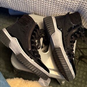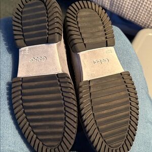 Elegant black leather shoes with gray accents. Ideal for formal occasions. These booties are in great used condition. They have 2zippers for easy on/off. They can be dressed up or down. They are UK size 6.5, which equates to US size 8. I usually wear size 7 and they are too big for me. From pet and smoke free home. Make me an offer!😉