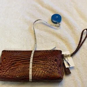 Elegant chestnut clutch with croc-embossed texture. Features a wrist strap and gold-tone accents.