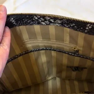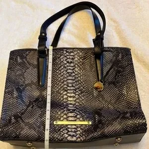Stylish Brahmin tote with a snakeskin pattern. Features black and gray tones. Ideal for versatile use.