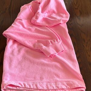 V-neck, pink pullover hoodie with a relaxed fit. Features a drawstring hood. Please note: the color is not saturated, but has some fading at the seams. It has a more vintage, favorite sweatshirt look. Curved hem. Worn once.