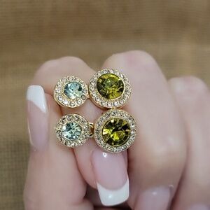 Simulated semiprecious stones surrounded by micro shimmer rhinestones. Hinged for movement. Hypoallergenic posts.