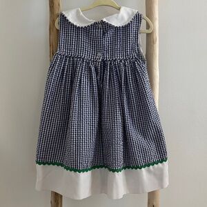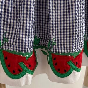Adorable kids dress featuring a classic blue and white gingham pattern with charming watermelon motif. Perfect for playful days and special occasions. Includes matching bloomers.