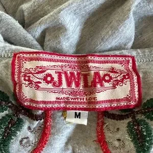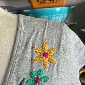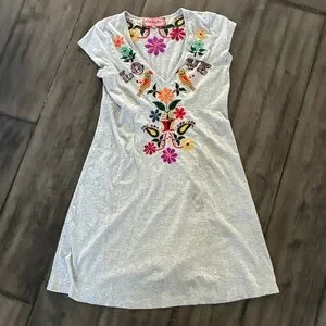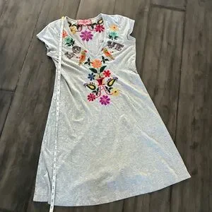 Super cute tunic dress with eye catching embroidery. Heathered gray. Size medium. Shown on a size 6 mannequin.