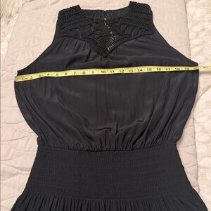 Excellent condition. No flaws. Chic sleeveless mini dress with layered skirt. Features intricate neckline design. Perfect for stylish outings.