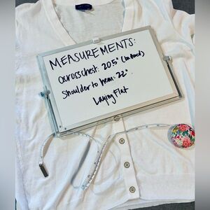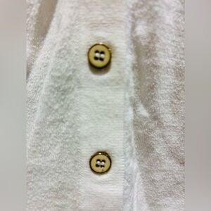 Chic white v-neck cardigan with gold button closure. 3/4 length sleeves. Adds elegance to any look.