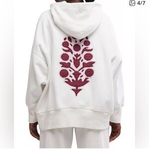 Features: Soft fabrication, buti logo, hooded neckline with adjustable drawstrings, ribbed hem and cuffs, drop-shoulder sleeves, slits at both sides, high-low hem, seam detailing throughout, hand pockets