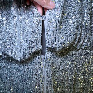 Shimmering silver sequined midi dress with a classic silhouette. Crew neck with cap sleeves and shirred waist. There is a back slit with hidden zip and hook-and-eye-closure. Fully lined. Hits about mid-calf. You will sparkle!!! *NOTE - the non-stock photos look darker due to lighting conditions.