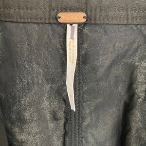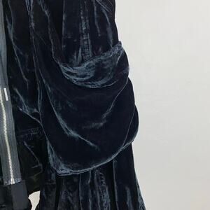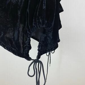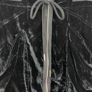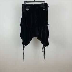Black velvet full front zip skirt with a drawstring waist. Belt-like details. Asymmetrical hem. Dropped pouch pockets. Ties at the hems.
