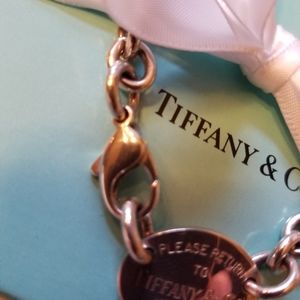 Elegant silver necklace. Features iconic Tiffany & Co. tag. Accented with a white ribbon.