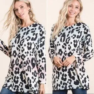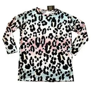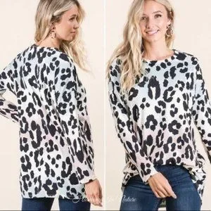 Keywords: pastel animal print top, long sleeve soft top, Bombom made in USA, pastelcore boutique wear, ombre leopard blouse, comfy chic top, soft girl style